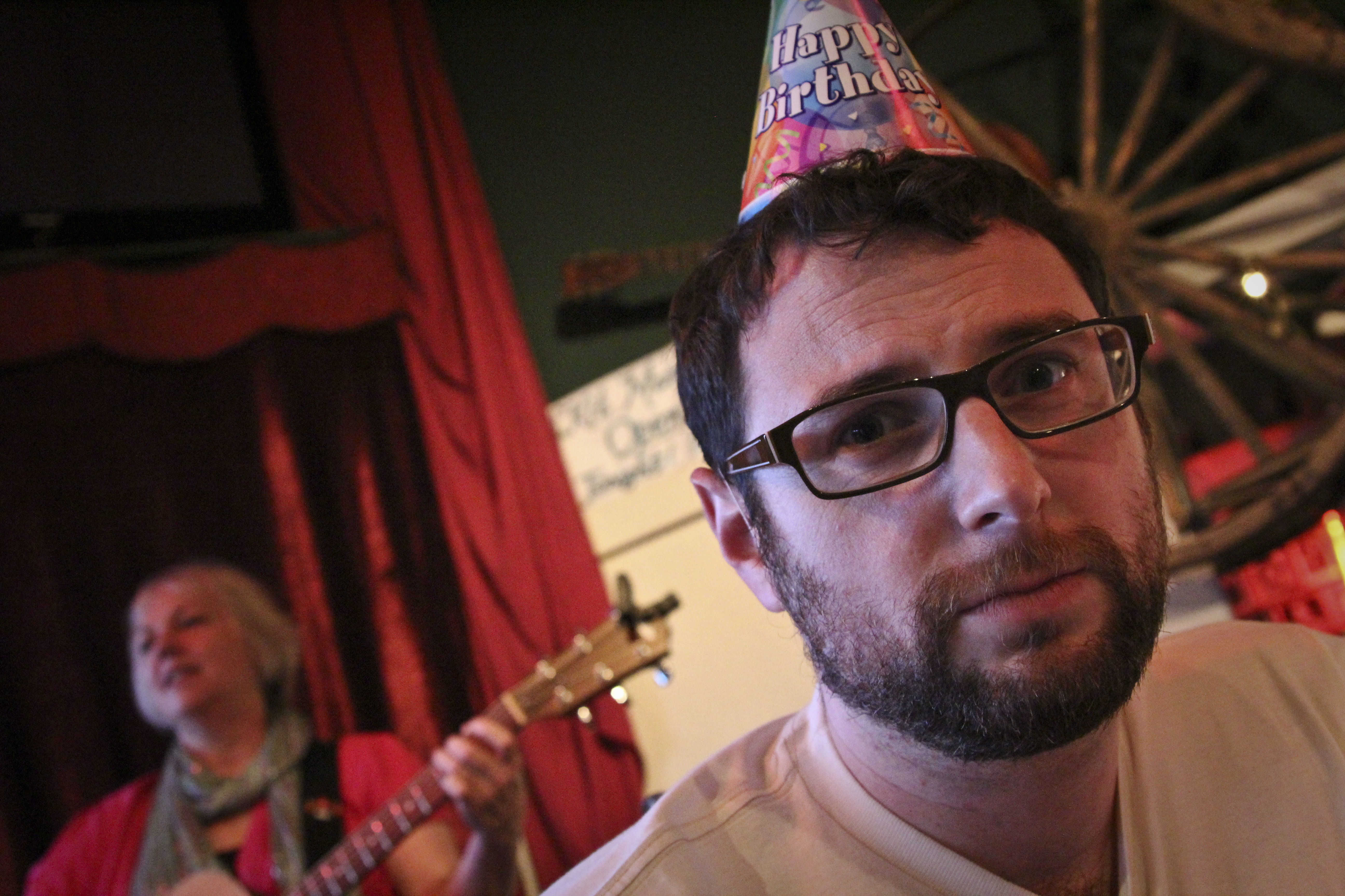 This photo is from last night’s dinner at Main Street Station in our charming little town of Guerneville, CA outside of Sonoma.  The event was Adam’s dad Richard’s 70th birthday dinner.  We enjoyed pizza, beer and wine as we were entertained by open mic night’s finest… including our very own Richard Schulman (Adam’s dad) on the clarinet!   This is a photo of Adam, taken shortly before our exit.