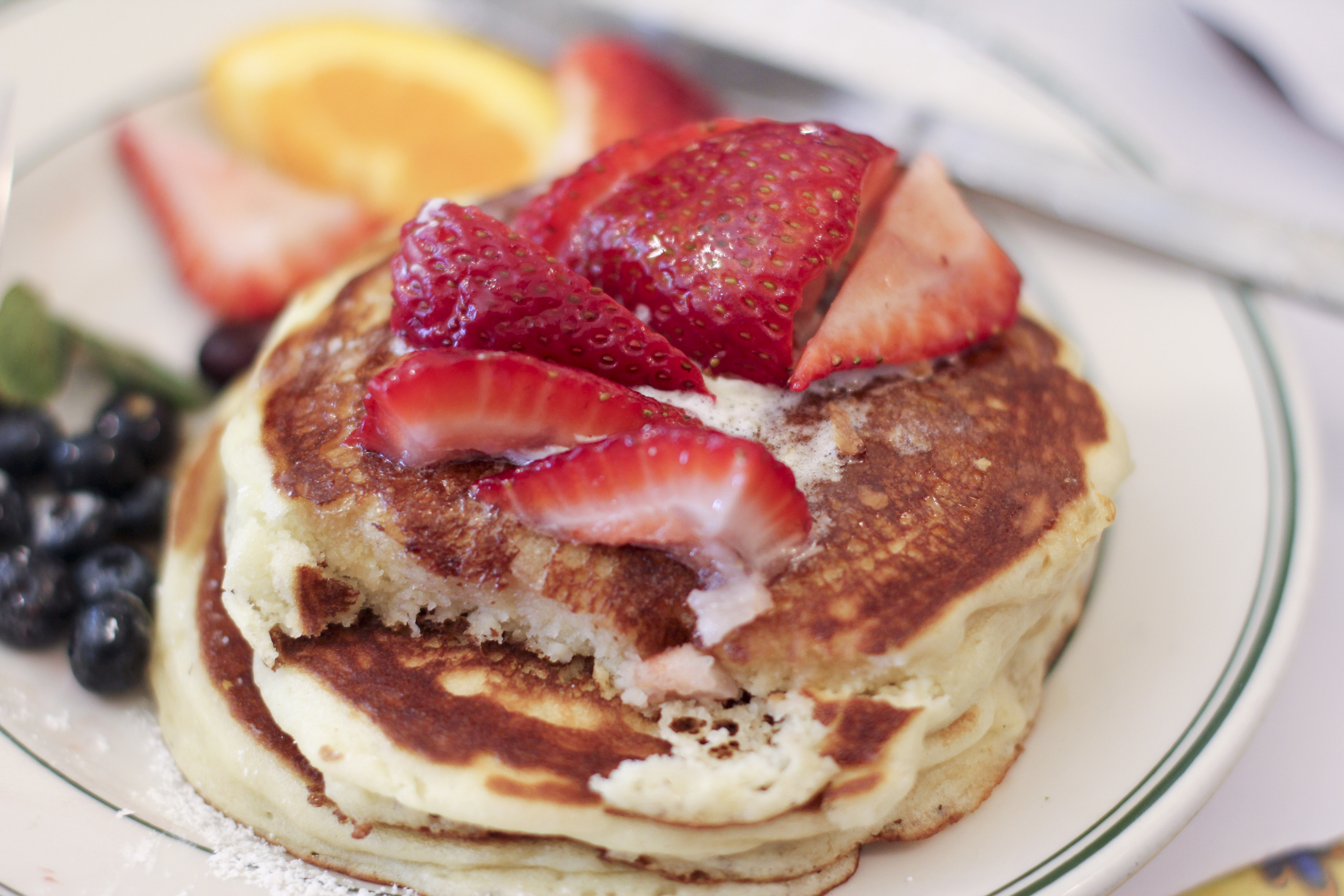 To start, we ordered a fresh-baked lemon blueberry muffin, which was light & fluffy, dusted with powdered sugar and bursting with juicy blueberries.  Dave also ordered a piece of their fresh-baked banana bread, which was moist and delicious.  For the main event, I ordered the SOB (south of the border) omelette – with black beans, salsa, sour cream and pepper jack cheese.  Adam ordered the french toast sampler – three different types of french toast… a banana bread piece, a Swedish cinnamon piece and a chocolate cinnamon piece.  Michelle (Adam’s niece) ordered the buttermilk battered pancakes with seasonal berries.  I thought they were the most beautiful pancakes I’d ever seen and I had to take a photo!