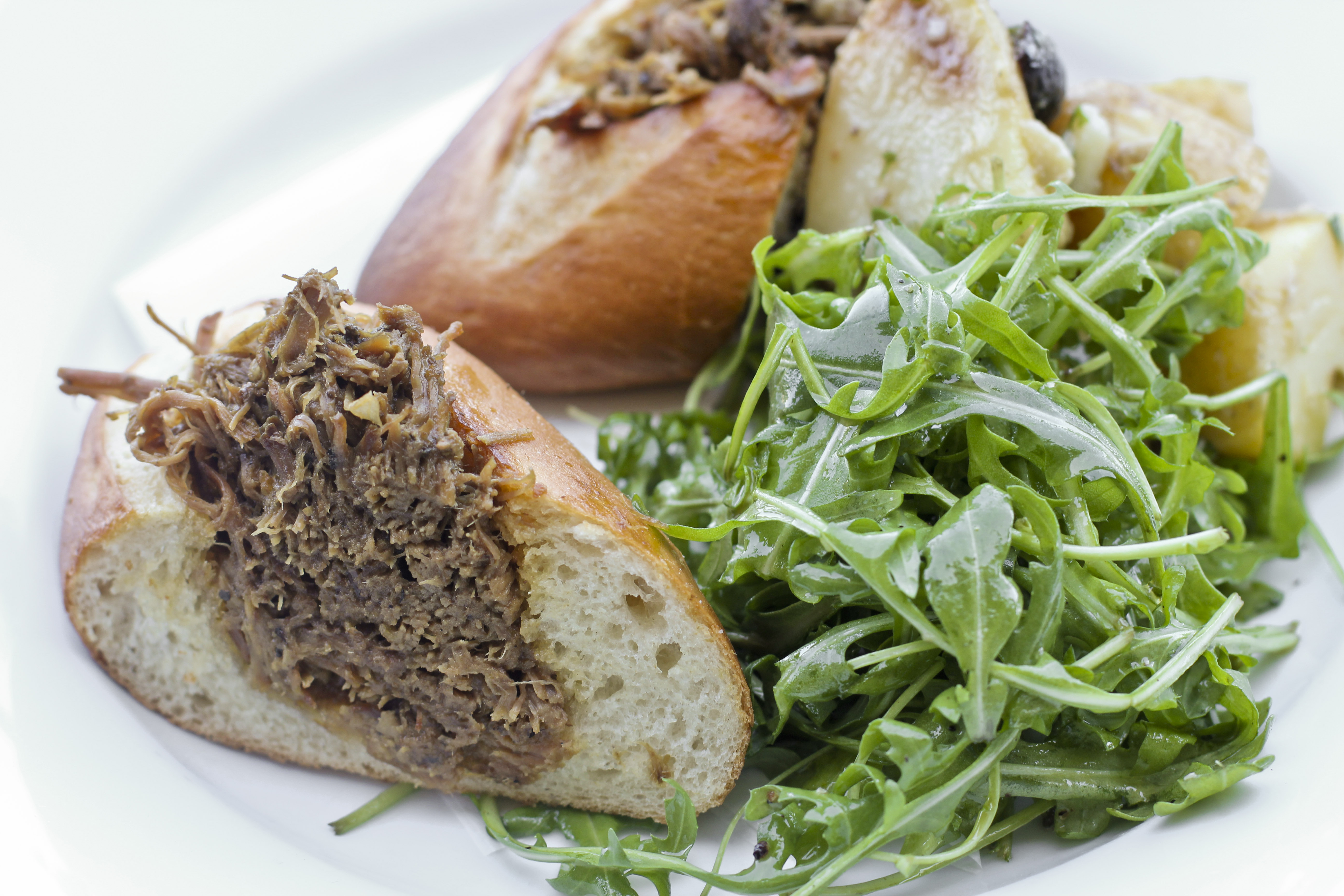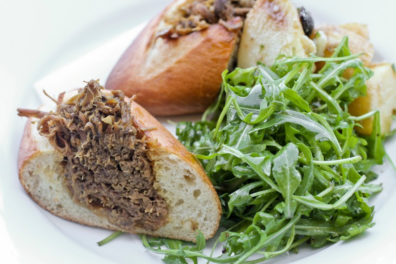 Adam (bless his pork-loving heart) ordered the pulled pork sandwich in a soft torpedo roll with green string farm potato salad and wild arugula.  He declared this meal the best dining experience he’s ever had.  The pork was super moist and bursting with spices and flavor – and the best part, was that it was tucked into this little boat of a torpedo roll, that was so soft, the whole thing just sort of melted in your mouth when you took a bite.  It was sinful.