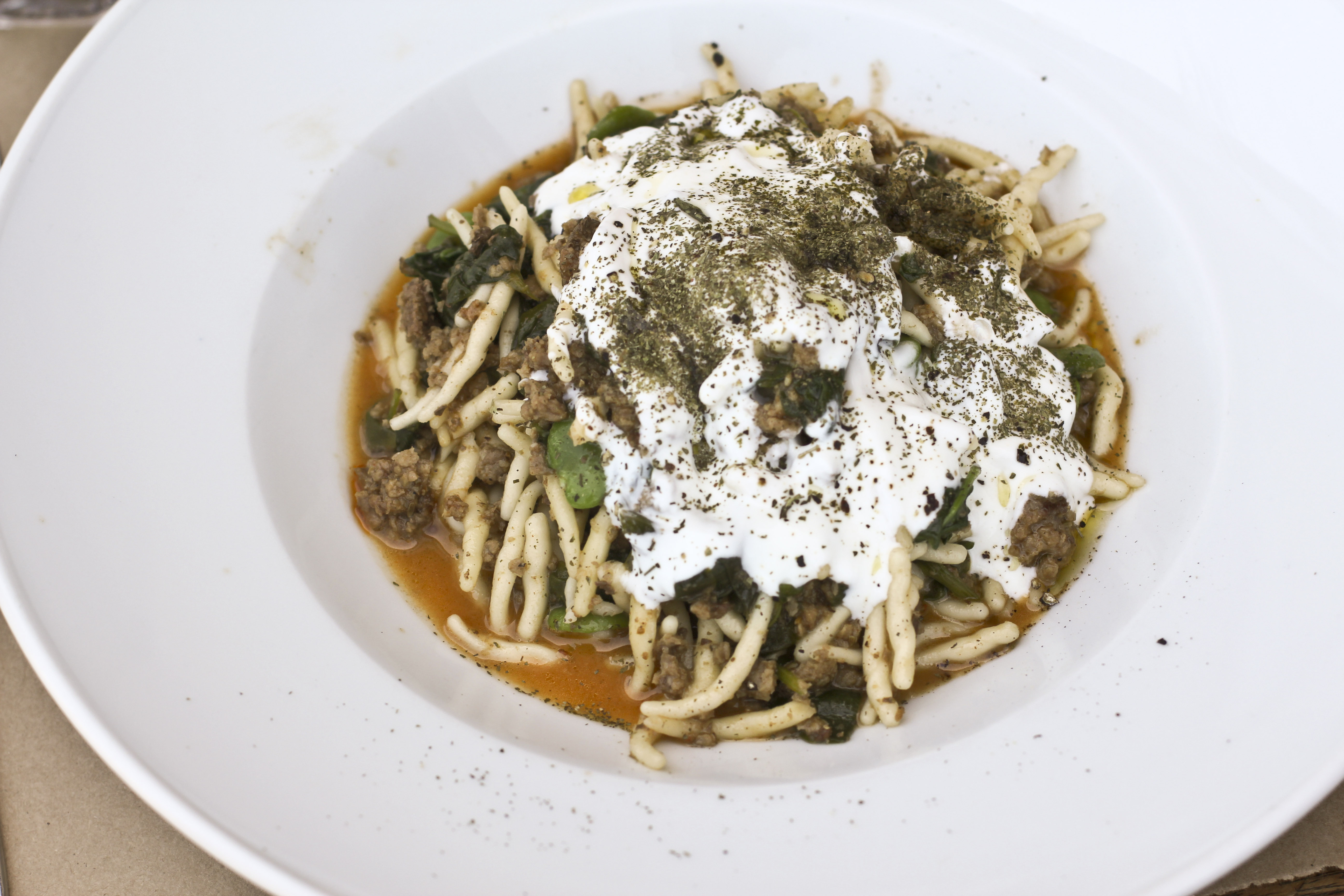 For our lunch, we ordered three different dishes so we could share tastes all around!  I had the Turkish pasta with cumin scented lamb, which was cooked with spinach, fava, parsley, yogurt and mint.  The pasta was trofie, which is from the Ligurian region of Italy and one of my favorites… it has a really nice consistency – a little chew to it.   This dish reminded me of the scene in Ratatouille where the mean critic tastes the ratatouille and gets transported back to his childhood.  This dish didn’t really transport me to my childhood – because I wasn’t eating things like this when I was a child… but from the first bite, I was just blown away by the care and love that was so apparent in the dish.  It felt like a home cooked meal that had been slowly cooking for hours and hours – there was so much depth of flavor and richness, but it was still bright and lively tasting with the yogurt and the mint!  It was amazing and I ate it until my stomach hurt from fullness.