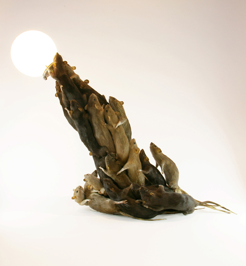 I took this photo yesterday in a really cool gallery Adam and I happened upon while taking an afternoon stroll through the hood. The gallery/shop is called The Future Perfect located on Great Jones Street and they had some of the most unique art/furniture/objects I’ve ever seen – quite strange stuff… some kind of dark… most kind of quirky… all very interesting. The rats above are actually part of a lamp called “Rat Swarm” created by an artist named Alex Randall. The lamp features 27 taxidermic rats swarming and clawing at each other to reach the light at the end of the lamp. Here is a photo of the lamp in its entirety, which I found on ravishingbeasts.com:
