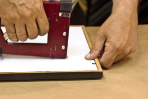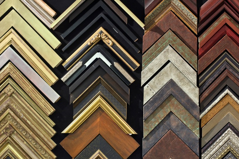 I took this photo inside a frame store on my way to the farmer’s market yesterday. I was walking happily along when I stumbled across a discount frame basket sitting outside the shop. I found all these cool different sized black frames with gold beading for $10, $5 and $3, which I thought would go perfectly in our newly decorated bathroom! All the frames were without glass and backings… just the frames, so I didn’t exactly know how that would work… but I brought them inside and the man who owns the shop put backings and glass in them all for $5 a pop. Amazing! I actually took pictures of him stapling the fasteners onto the back (never seen this done before and was fascinated),