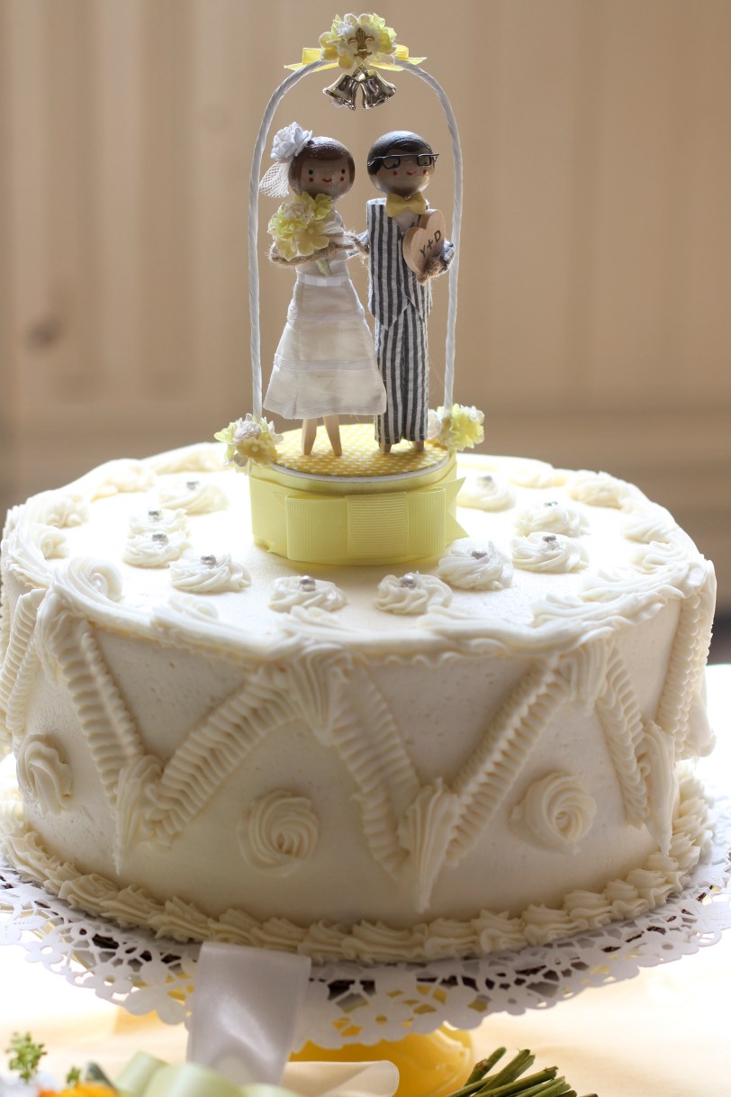 Almond wedding cake with custom bride & groom topper