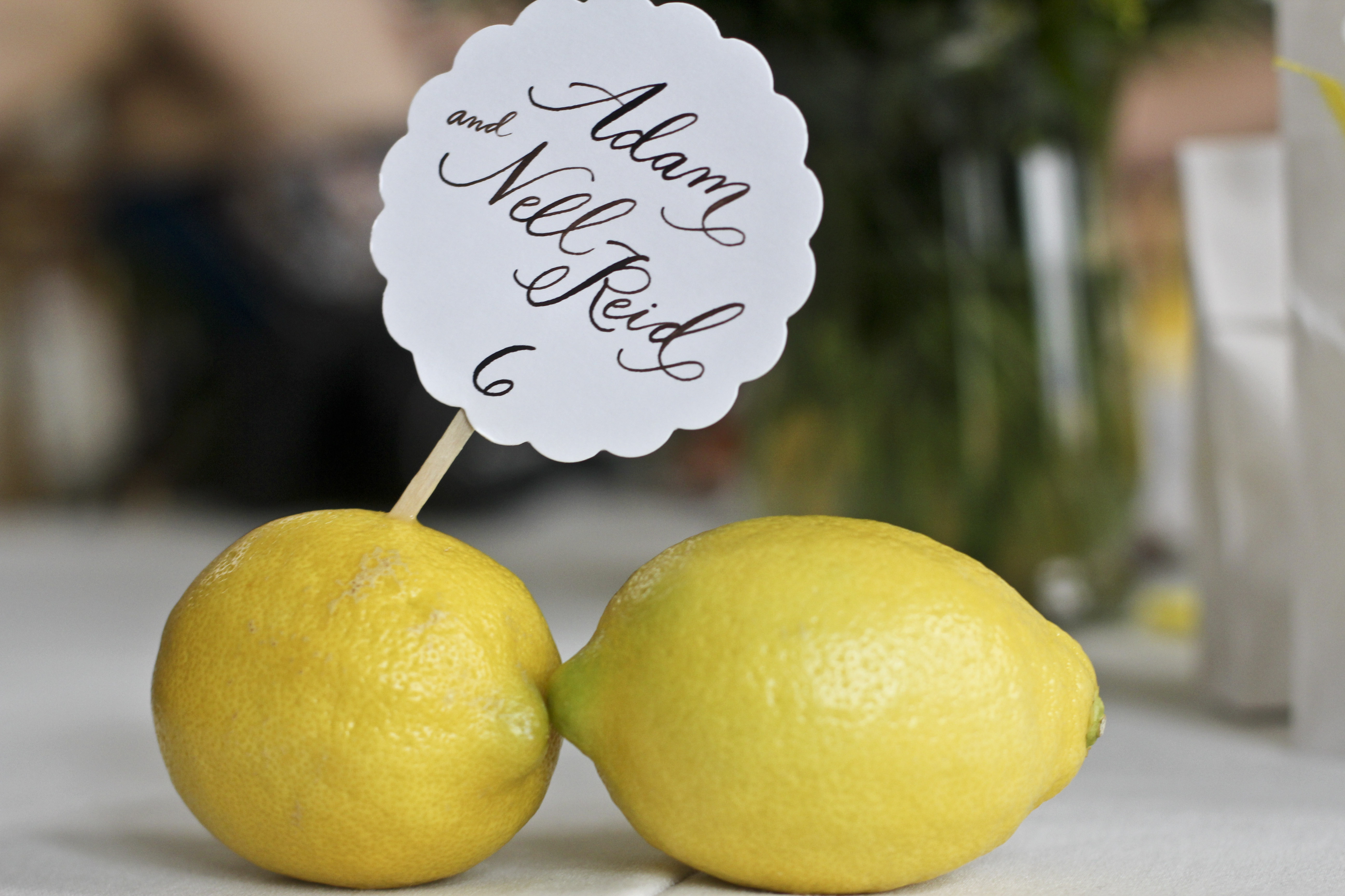 Then came the main event.  Yvonne’s favorite color is yellow – so yellow was the theme running throughout.  Our seat assignments were made of adorable lemons with the most beautiful calligraphy:
