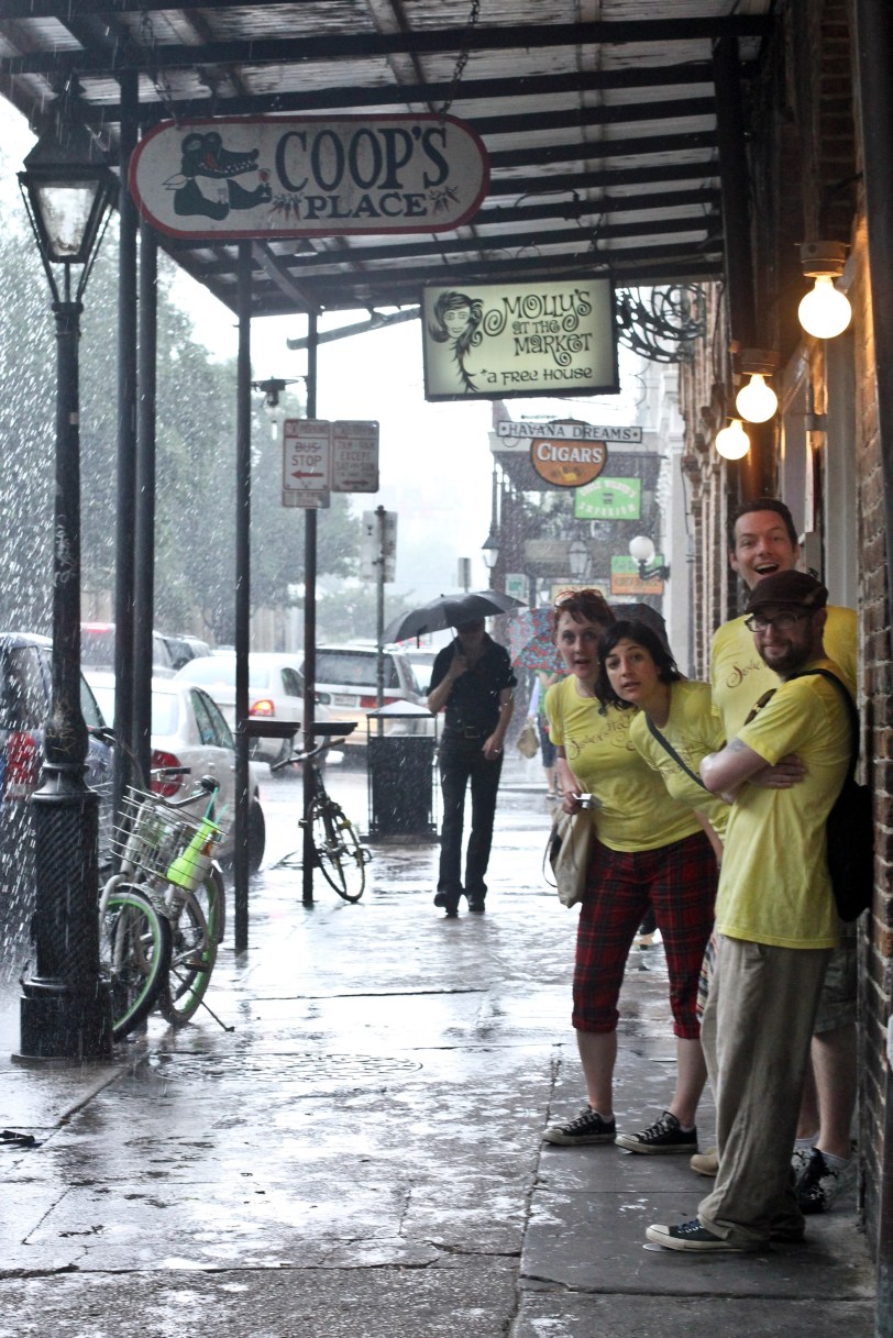 For our final day, we started off with a little taste of beignets (fried dough type things w/powdered sugar) from Cafe du Monde.   Our crew was a little late to the breakfast, so there was a HUGE line when we got there.  We met up with the others who were already seated and they gave us their scraps.  Then the stockers went off on our own to find a good lunch spot.  On our way to eat, we got caught in a crazy thunder storm – then ran for shelter to Coops Place – a restaurant that had been recommended by some friends.