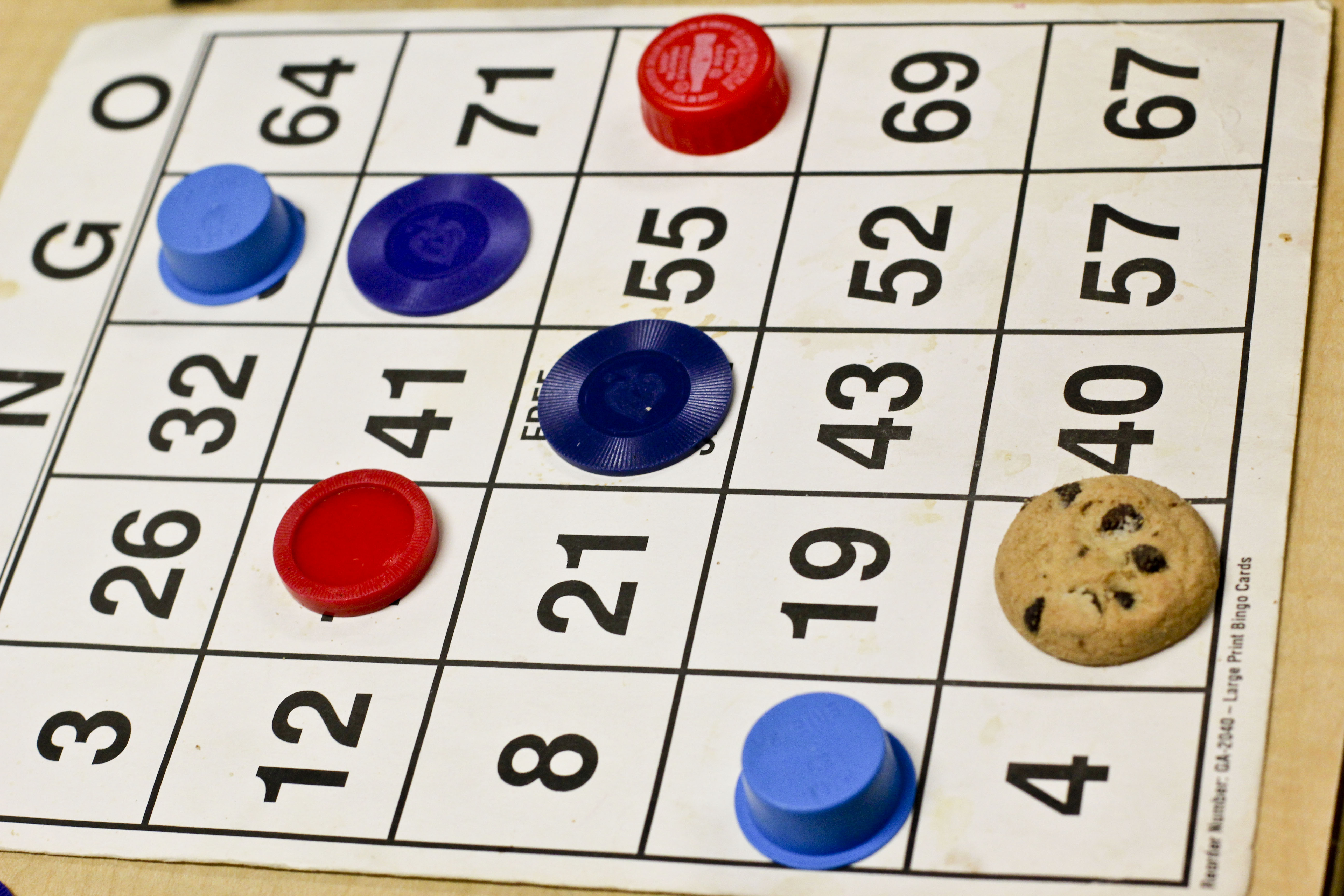Here is a photo I took several weeks ago during BINGO.  Jamo won a bag of chocolate chip cookies in round one and then got mixed up and was using his cookies as BINGO markers and putting the BINGO chips in his mouth.   After I stopped him from eating the BINGO chip, I had to take a picture.