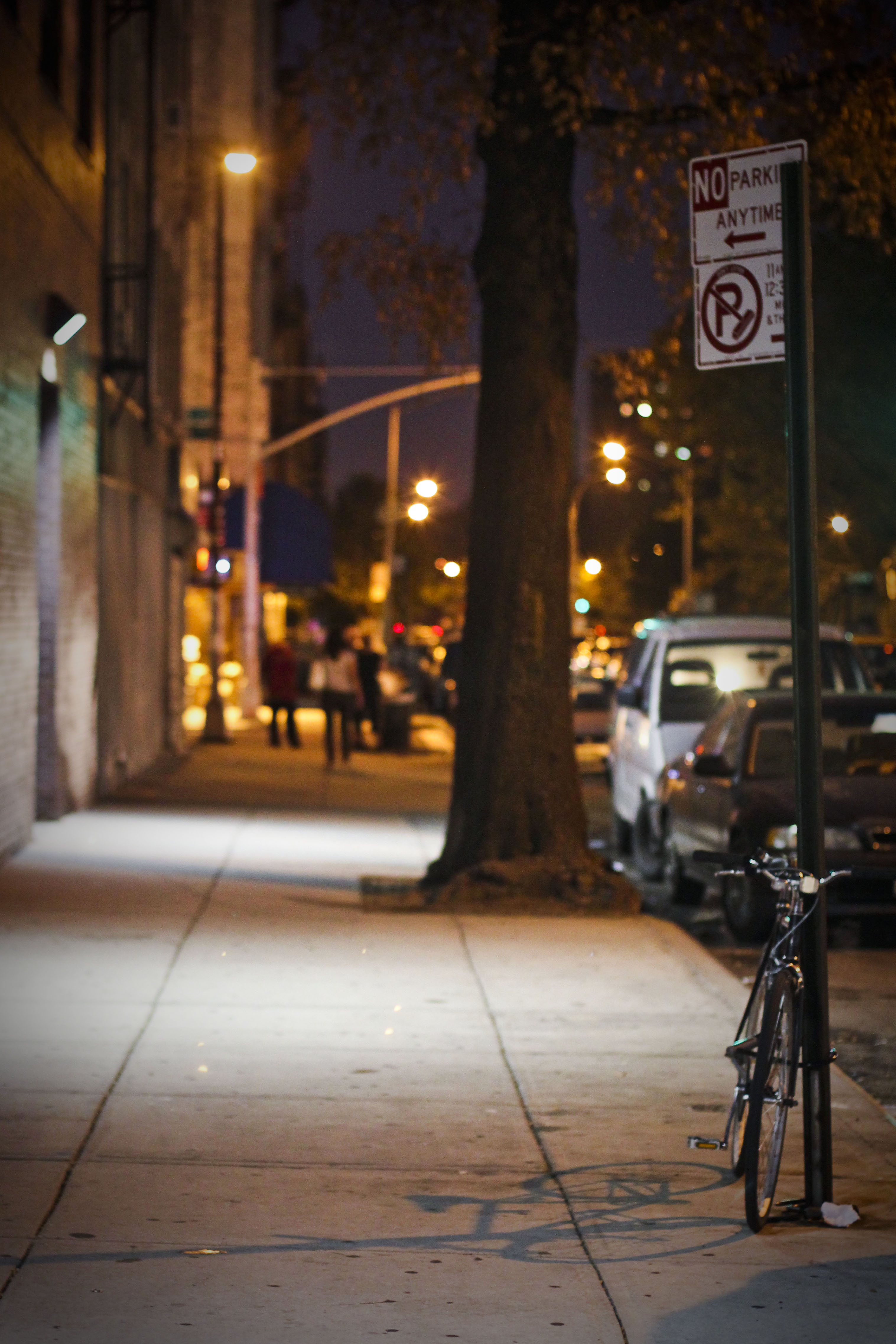 This is my block – outside of my apartment building on Friday night. My aim was to capture the bicycle and it’s shadow. I was also attracted to the pools of light on the sidewalk coming from the outside lights on my building. Also the purple-glow of the sky and the coppery light on the leaves of the tree.