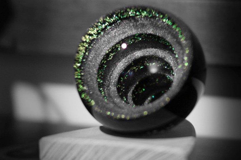 This is a gorgeous glass marble blown by our good friend Ben. The marble is sitting on Brette & Ben’s bookshelf – I eliminated all the extraneous color because I felt like it was a distraction from the beauty of the marble itself. I still don’t even feel like I captured its beauty to the fullest. It has all these layers and depth – spiraling inward. It’s quite outstanding. I still have plans to go to Ben’s workshop out in Long Island and photograph him blowing glass – we just haven’t had the time this summer to arrange it quite yet. I think it’ll be a challenge to get the glass to look as beautiful in a photograph as it does in real life… without the 3-d element… but hey, challenges are good – I’m sure I’ll figure it out as I go.