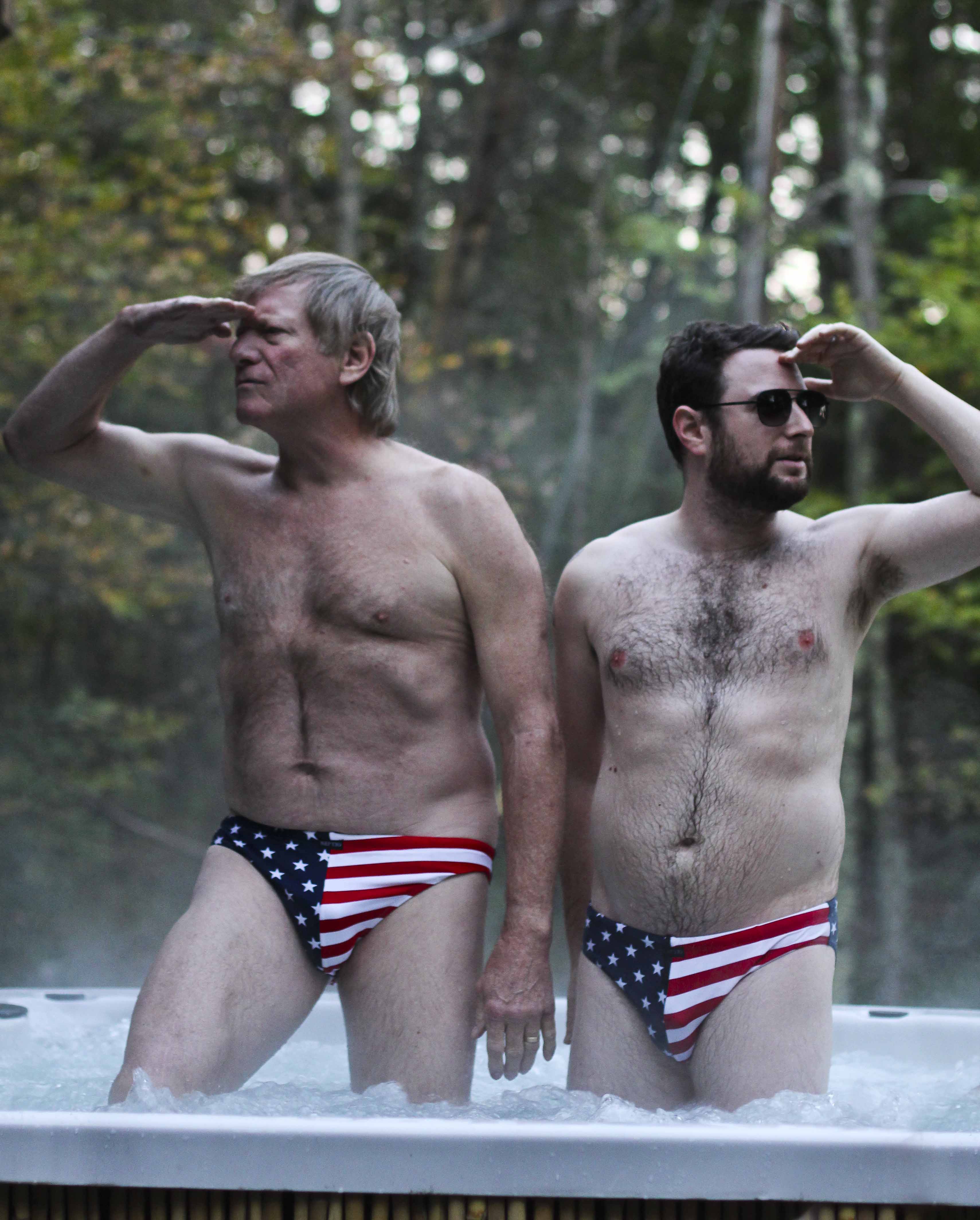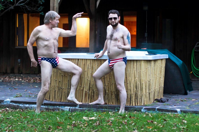 After lunch, we raced home to do our “Patriots” photo shoot in the hot tub while there was still light. So… before more pictures, let me explain. First… if you’ve seen Hello Lonesome, you know that Harry Chase’s character “Bill” sports these babies a few times when he’s chilling at home in his hot tub. Yes – they were Adam’s idea. He’s a freak (yet a a brilliant and adorable one if I do say so myself). So… Adam got a pair of them too while shooting the film two years ago. When we were packing for Woodstock, I decided to throw them in our suitcase – you never know when an opportunity might arise for an embarrassing photo shoot! Oddly enough – Harry brought his pair too – without being reminded – so a photo shoot was set! Here are some of my favorites: