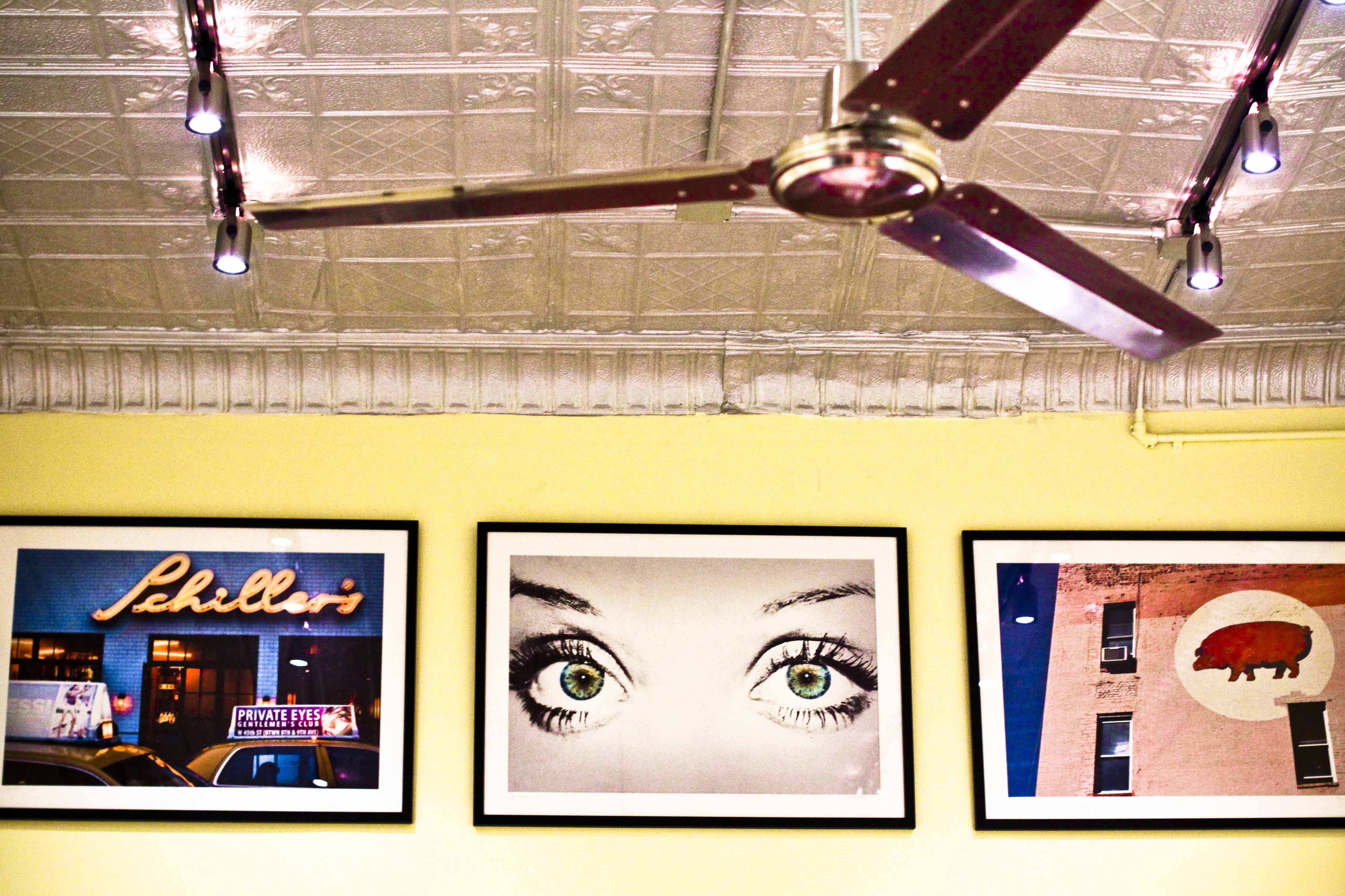 At around four o’clock, I zipped uptown to the Upper West Side to pick up my friend Mark’s car, which he kindly let me borrow. Then I zipped back down to 14th and 7th to the frame shop to pick up all my beautiful framed pieces. So exciting! Amie met me there and then the two of us drove to Clinton Hill to Brooklyn Victory Garden to figure out how and where to hang everything. Luckily, Tess’s husband Tom was there to help us out. This is one of those situations where I really needed a MAN! I’m sure I could have done it with Amie… but thank god for Tom. Hanging large pieces of framed art high up on a wall is quite a process. And thank god for Amie too… just like choosing which photos to display was difficult for me… deciding the order on the wall and where exactly to put them was definitely stressful! Thankfully, Amie is super decisive and she totally rocked it and made the process 100 times easier for me. Thank you Amie. 🙂