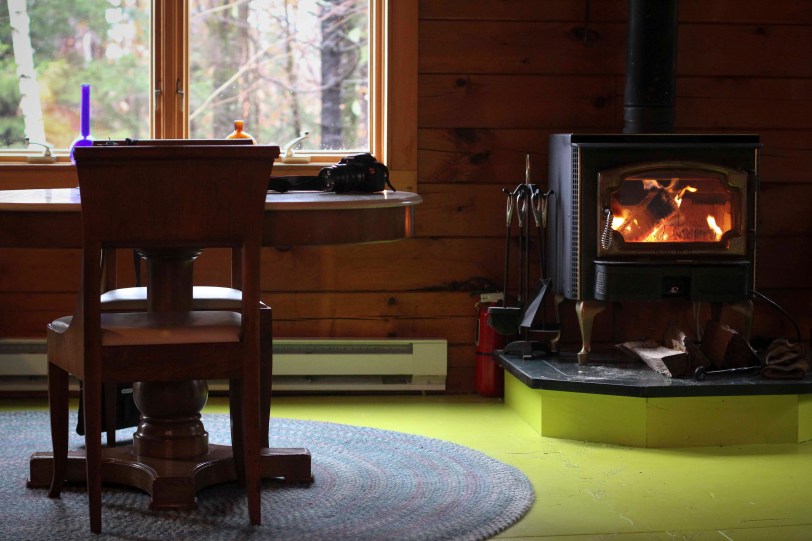 We got the tour of the cabin from Randy, one of the owners, unloaded the car and then hopped back in for a drive to the town to load up on groceries. When we got home, we got the fire going in the wood-burning stove and made a simple dinner – pasta with some local arrabiata pasta sauce, a big salad and some chicken breast I cooked up on the cast-iron skillet. Here is photo 208 – the fire, which became a major focus of our weekend! We’ve discovered we’re both sort of pyros!