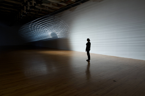One installation, by Tobias Putrih, stretches long strands of fishing line across a dark and cavernous gallery. Bunched neatly together, the parallel lines start high on one wall, ending low on the opposite one. A single light source illuminates the strands at about the midway point, causing an optical effect reminiscent of spinning rotor blades or a mystical halo.