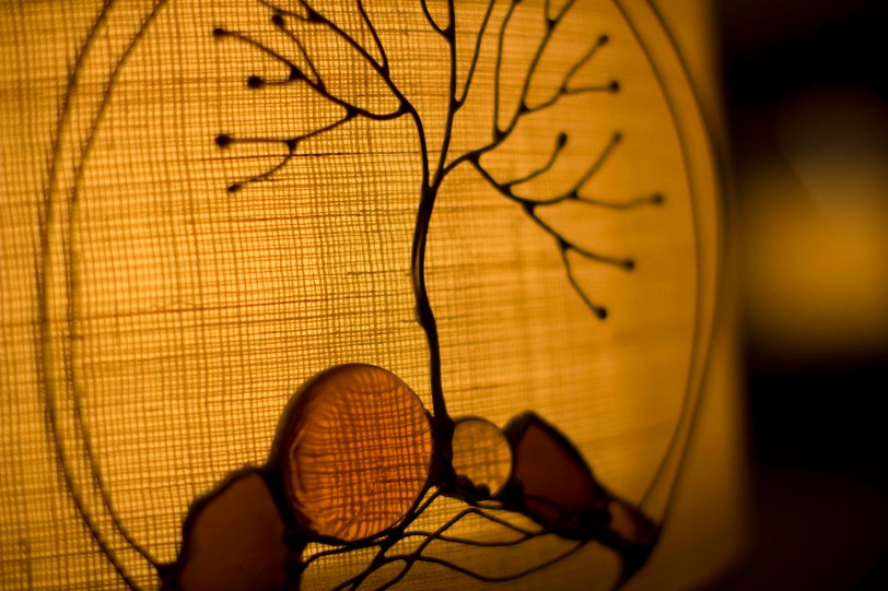 As for the photo, I just held the little tree from the top with my left hand in front of our cloth lampshade. I thought it would look cool to have the silhouette of the tree with light coming from behind through the stones. I also thought the color of the lampshade was a nice compliment to the amber color of the stones themselves. I really like how the texture of the lampshade looks – especially through the big stone on the bottom (sort of warped and magnified). I also like how in the background, the reflection of the lampshade in the mirror on the wall echoes the amber color as well – but I like how it’s blurred – so it’s just really an additional accent of that same color without being a distraction. It almost looks like another lamp in the distance.