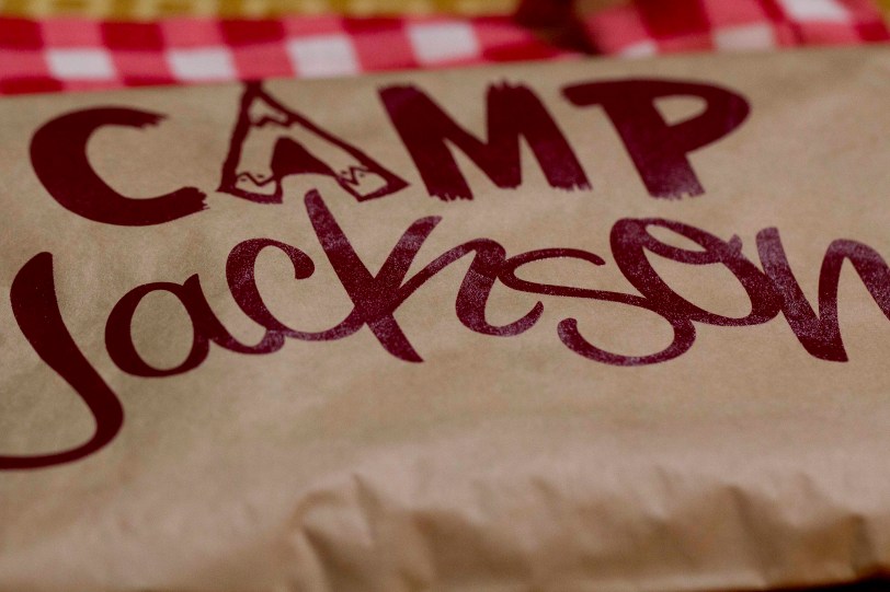 Thursday was day two of Camp Jackson. We started off eating breakfast outside on the brand new picnic table that was delivered that morning. Brett made amazingly delicious chilaquiles for breakfast and then it started getting cloudy and cool so we stayed inside and played for the rest of the day in our Camp Jackson PJ’s! Emily is a total Martha Stewart (but a much funkier version) – and she has an entire cabinet of colorful fabrics so we picked out some cool patterns and she sewed up some new camera straps for us! I’m loving my new one… it’s that purple and orange fabric in the group below: