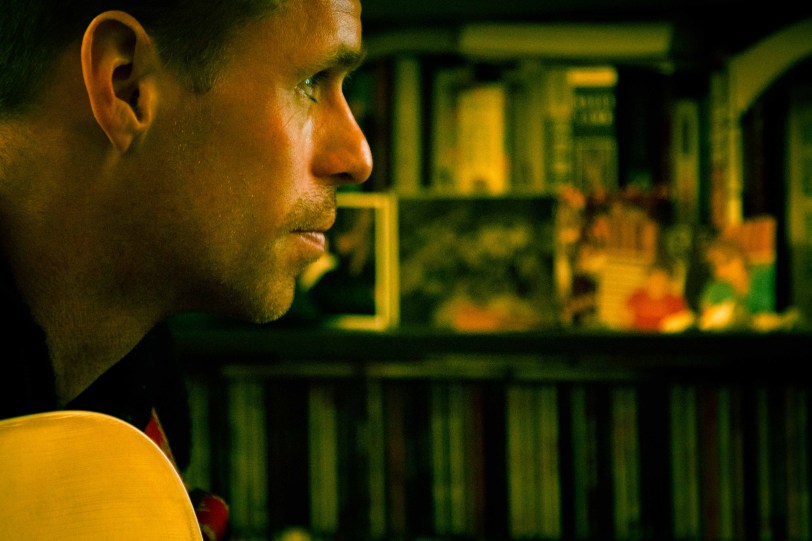 I took this last night while watching the Patriots get beat by the Jets. Boo. Rob here was playing the guitar in between plays. I made the background that greenish hue because it subdued it a little, allowing Rob’s face to stand out more.