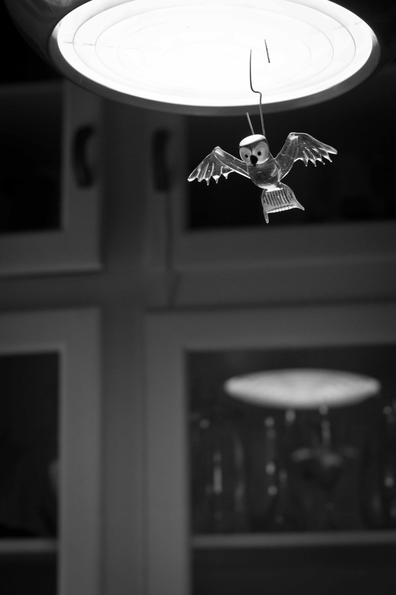 I took this at my friend Beck’s house yesterday – it is a funny little owl hanging from the lamp above her kitchen table.  It is translucent and I like how the owl was sort of glowing with light from above.