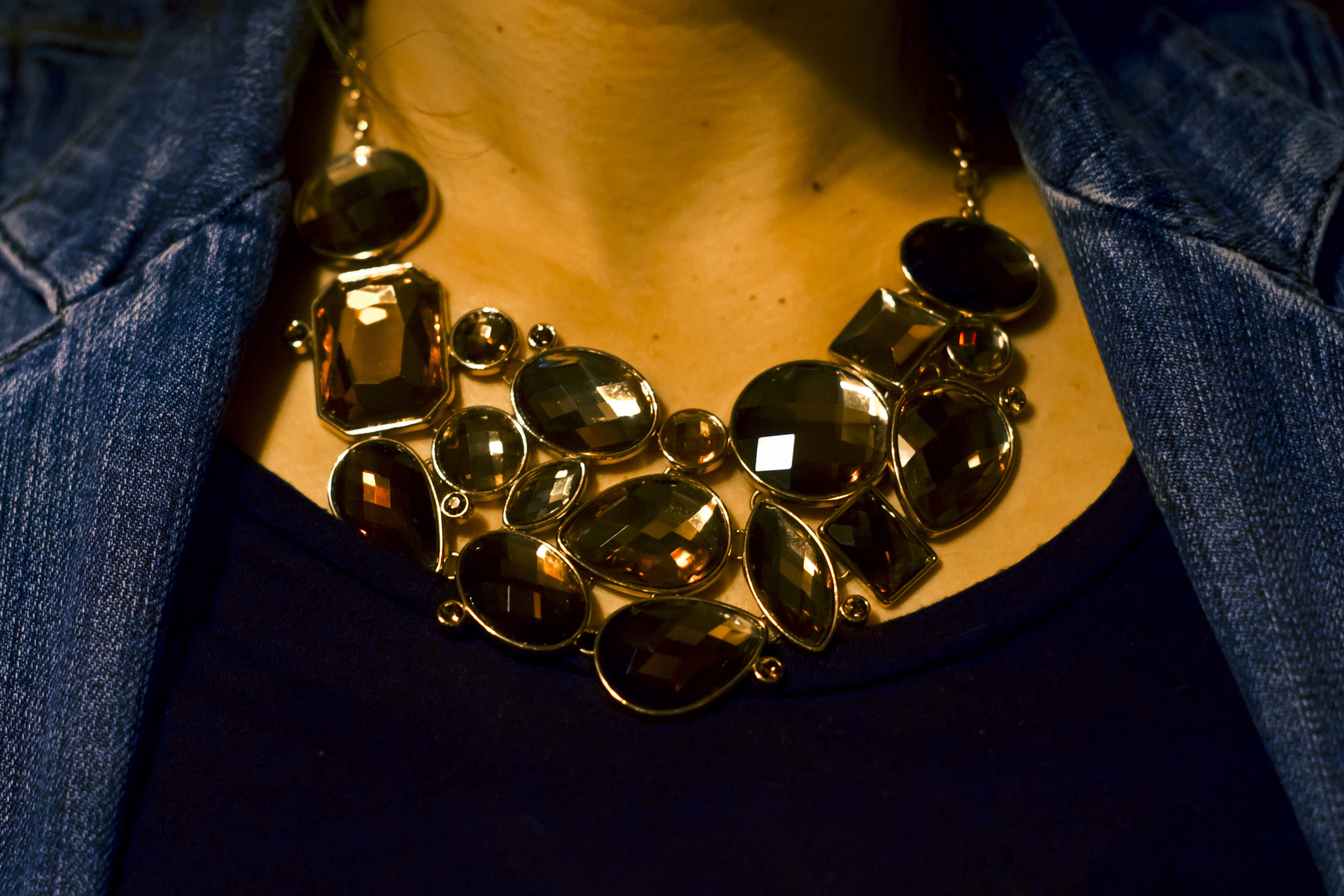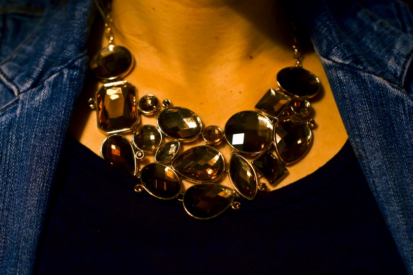 This dazzling piece of flair here belongs to my friend Jaime.  We had dinner last night at Mary Queen of Scots – a newish restaurant on the Lower East Side.   We were there for a special Scotch tasting, which was accompanied by some yummy snacks like Devils on Horseback (apple chutney filled dates wrapped in bacon and baked).  Delish.  Of course, I indulged a tad, but tried not to go crazy.   Everything in moderation right?  And no – this is not a bad spray tan.  Jaime is not this orange in real life.  I was having fun contrasting the blue and orange to make the necklace pop more.  Do you think it works?  I questioned if it was too much… but it was my first impulse so here it is.