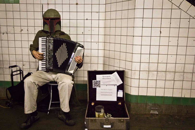 We saw this guy in the 14th street F station yesterday. When we arrived he was playing Mad World by Tears for Fears and then as we were hopping on the train, he started playing the Super Mario Brothers theme song. Awesome. He has a fan page on Facebook, a Twitter account and countless videos on Youtube. In a video interview, he claimed that he actually makes his rent by performing as a street musician. He also said that he definitely makes more money when he wears the Boba Fett helmut. Meanwhile, taking a closer look at the sign…