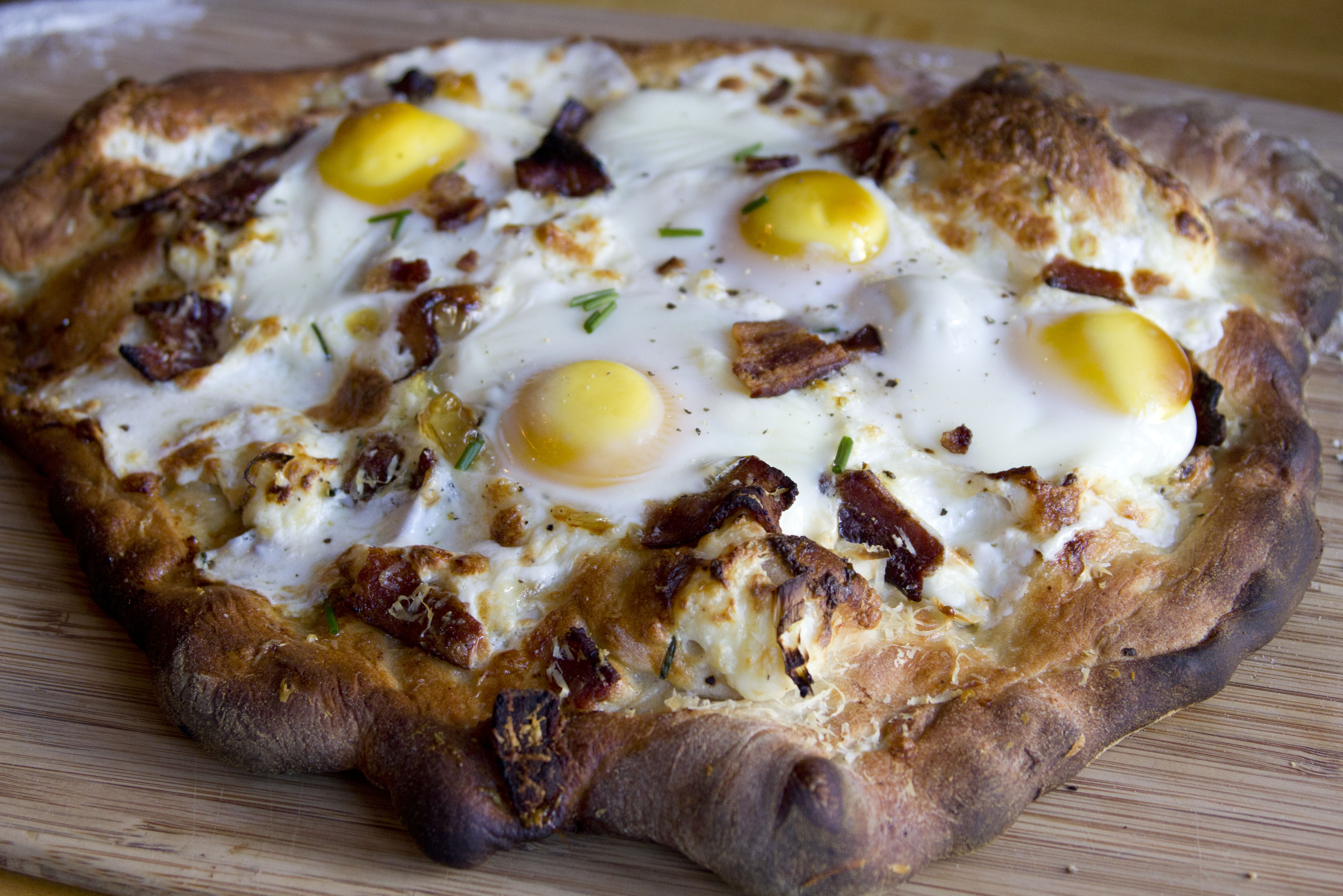 Meanwhile, Adam got inspired by a breakfast pizza recipe he found on Smitten Kitchen, so he adapted it to our liking and it has since become our new favorite breakfast treat.  Last weekend (and the weekend before), we invited over friends and made breakfast pizzas – topped with scallions, chives, garlic, bacon, some ricotta, fresh mozz and then finished with eggs and some fresh-grated parm.  Stupendous!  Here is a picture of one of Adam’s specialty breakfast pies: