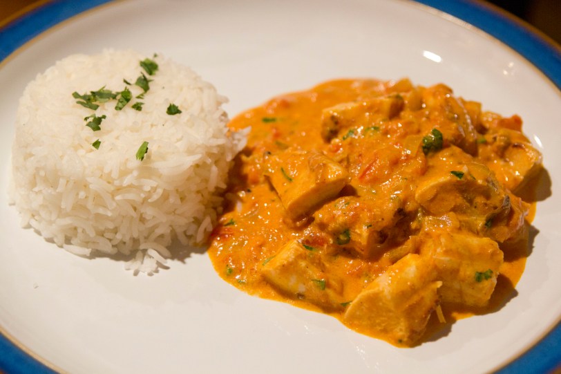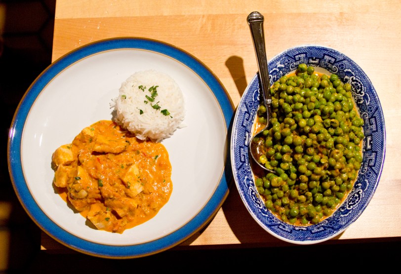 I often get a craving for super flavorful, creamy, spicy, saucy Indian food.  However the Indian delivery in this neighborhood has left me rather cold.  I mentioned in a previous post how I picked up some Indian spices recently so the other night, with my friend Robyn coming over for dinner, I decided to make an Indian menu.  I used a Cooks Illustrated recipe for Chicken Tikka Masala and a recipe for Matar Makhani – Green Peas with Creamy Sauce from Madhur Jaffrey’s Quick & Easy Indian Cooking book.  Alongside I made a simple basmati rice to soak up the yummy sauces.