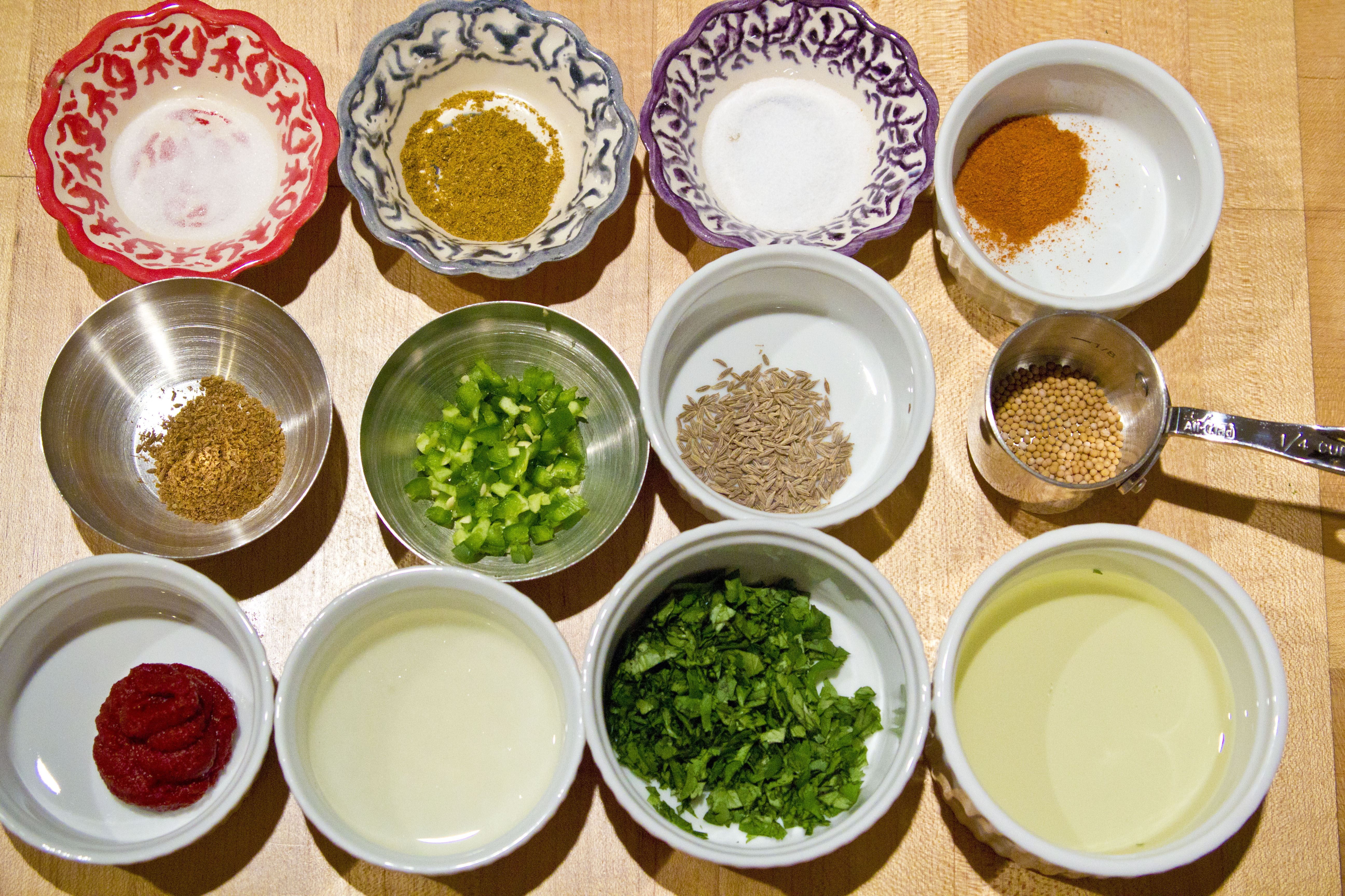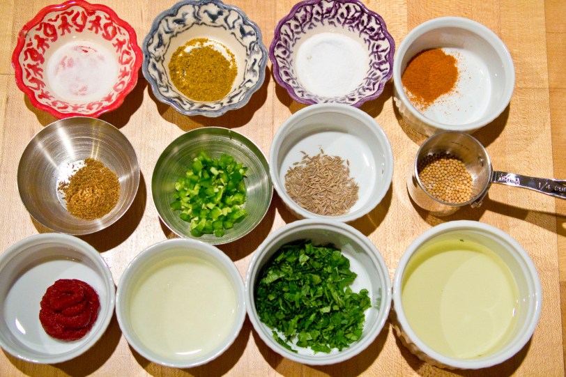 Well – I must admit that the preparation for this meal took me quite a while (overall prep and cooking time was about three hours!) – however, it was SO worth it!  The flavors were incredible!  And it was rather pleasing measuring out all the beautifully colored spices and ingredients into my little ramekins (you know I have a love for ramekins).  These were the measured out ingredients for the peas… I had even more measured out for the chicken!