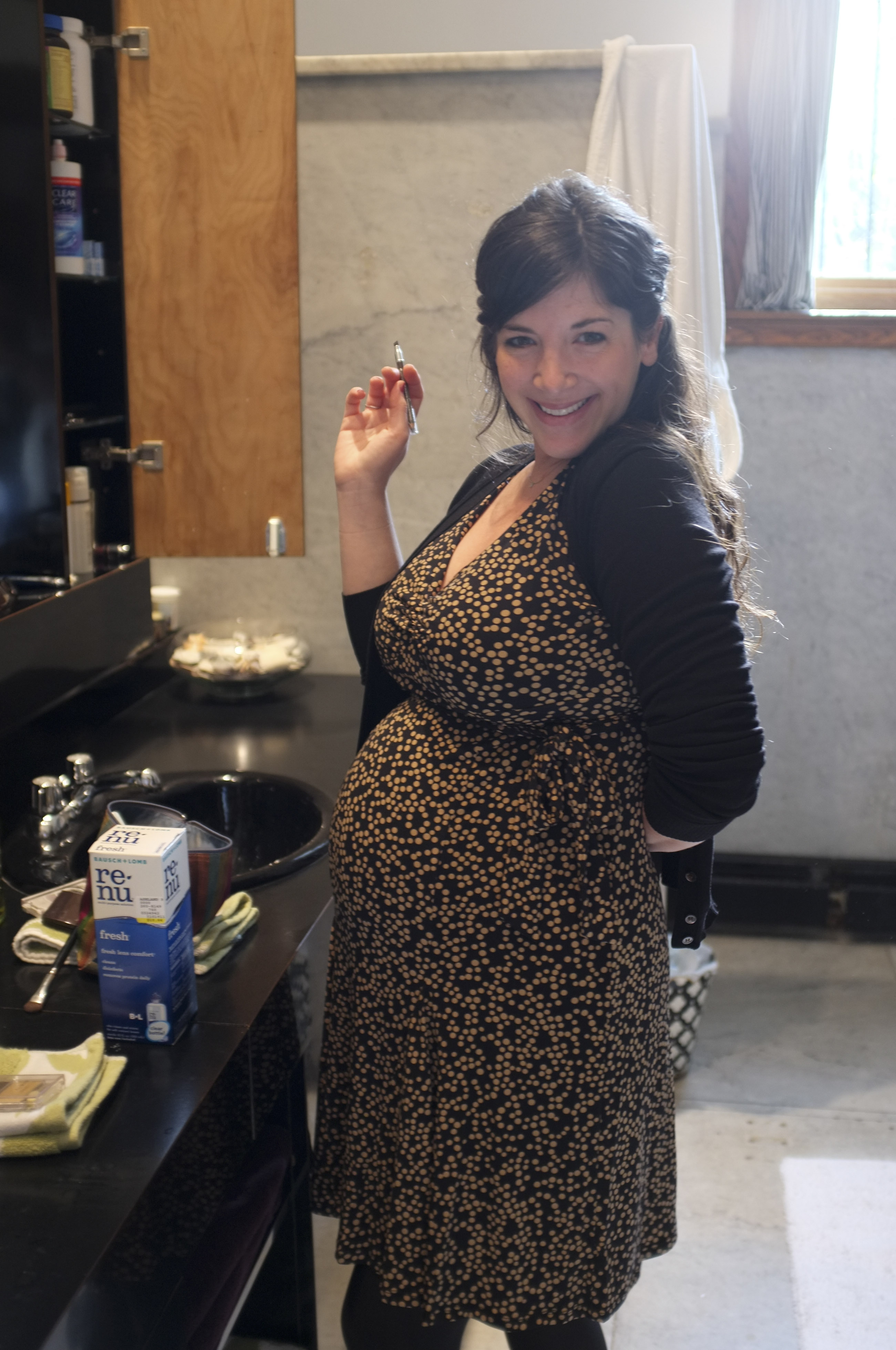 Yes that’s right…  I’m officially looking and feeling like a pregnant woman now.  My belly is quite large (though I’m still finding it rather cute thus far) and I’m starting to get some pain in my lower back and butt so I’ve definitely got a little pregnant waddle going on. Oye.  I still have three months to go!  That’s a little bit scary.  The subway routine is definitely getting a bit tougher these days.  I surprised myself while huffing and puffing up the stairs at the 2nd Avenue stop yesterday. Lately, in fact, I’ve grown fond of skipping the stairs altogether and opting for the elevators (at those stations that are blessed with elevators).  Here is a photo of me from this past weekend – there’s no mistaking it now… this girl is PREGO!