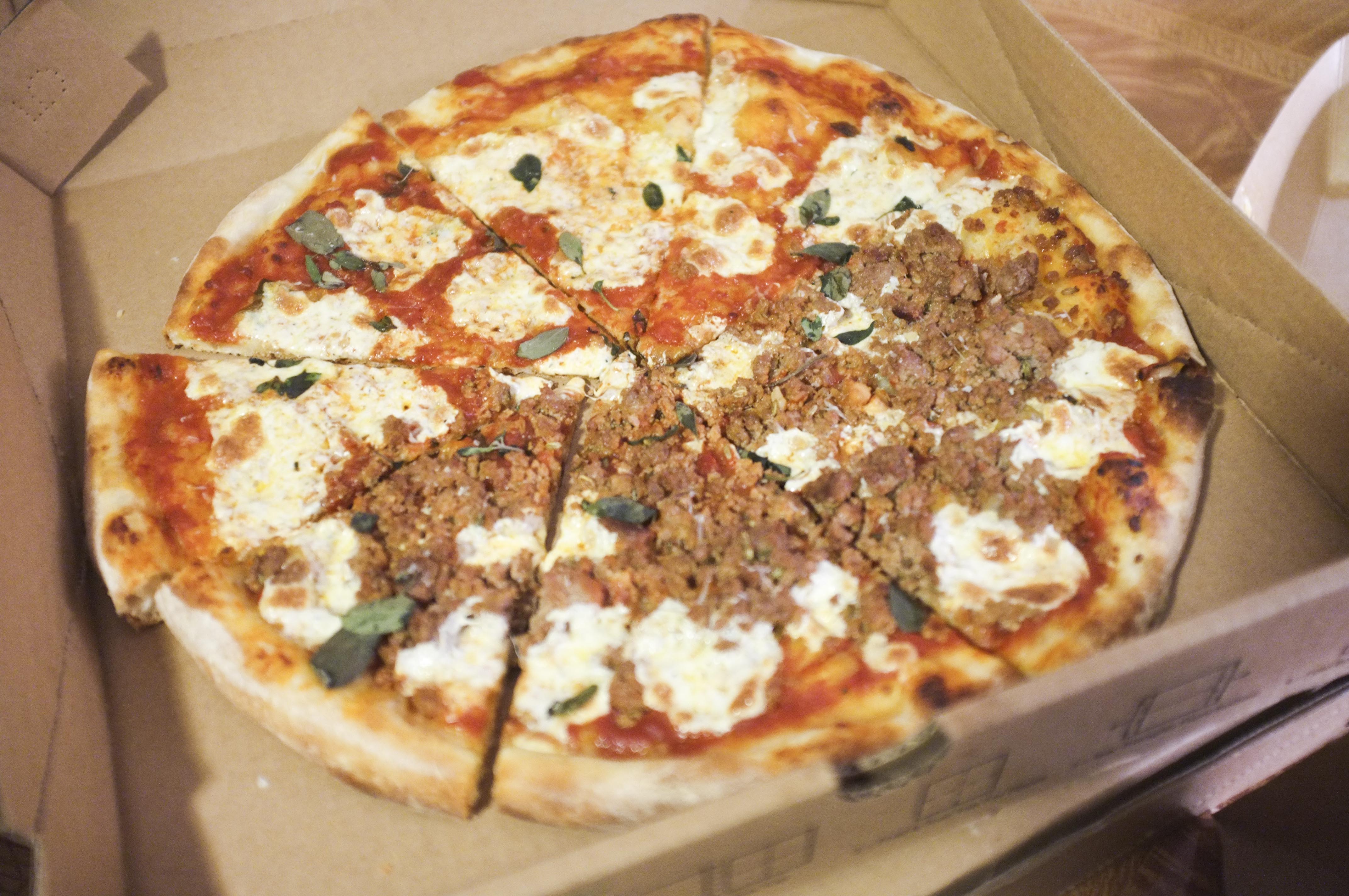 One Pie – Half Brooklyn (Tomato, House-Made Mozzarella and Marjoram), Half topped with House-Made Sweet Sausage