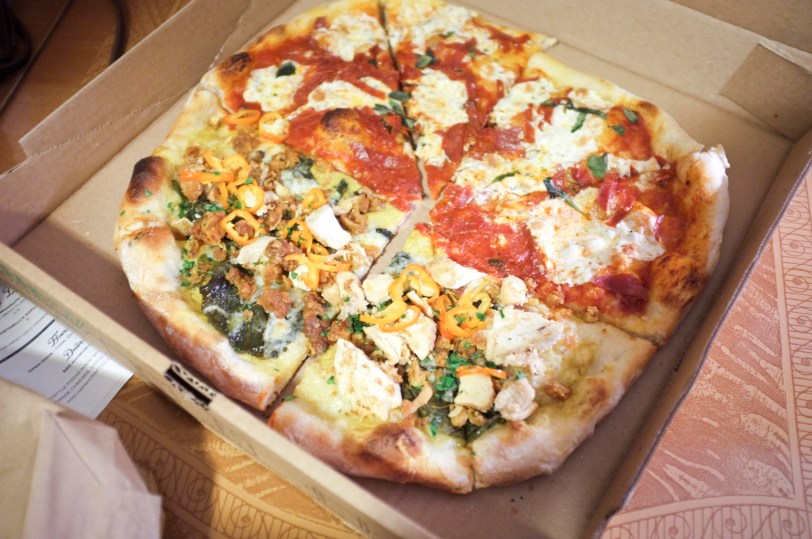 I enjoyed the pepperoni pizza – they sliced up their pepperoni in thin strands and scattered them pretty uniformly throughout, which I liked… you got a little bit of pep in each bite! The cold-fried chicken pie was not my thing. The collards were hard to bite through and I just wasn’t crazy about the overall flavor in this pizza. But the rest were winners!