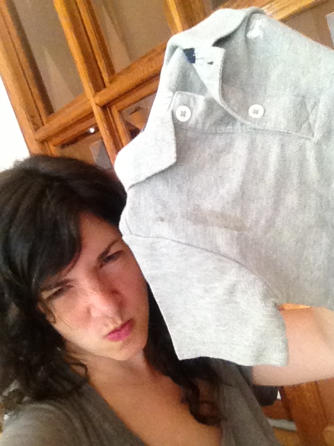 About six weeks ago, I went to Old Navy in the Atlantic Center Mall and bought Theo almost $90 worth of summer clothes.  Keep in mind – we are in Brooklyn, so we have to walk to the mall and walk home and I have to carry everything hooked onto the stroller (not an activity I like to do frequently).  So I get home and I’m going through his new clothes and I notice that the little gray polo shirt I got him has this big brown mark on it.  I obviously didn’t notice this in the store – but I figured it was like that when I bought it and it must have slipped by undetected while I was being rung up.  I kept the tags and stickers on and put it back in the bag to exchange.  Since then, we spent two weeks shooting Adam’s second feature film in our apartment (I’ll tell you more about that another time), we went away for our Brooklyn Boys weekend and then spent a week in the Hamptons while our ceiling was being re-plastered (tell you about that later too).  Needless to say – I have not had time to make another Old Navy trip… until last Thursday.